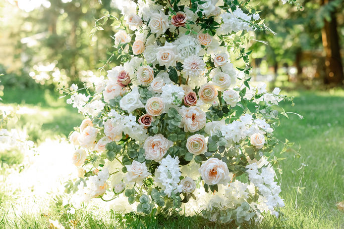 The Pretty in Pink Pillars are comprised of white playa blanca roses, soft pink roses, blush peonies, pastel pink dahlias, garden roses in peach and butter yellow, blush ranunculus, rose buds ranging from blush to mauve, white hydrangeas, and white delphinium, complimented with eucalyptus, and whimsy stems of clematis.