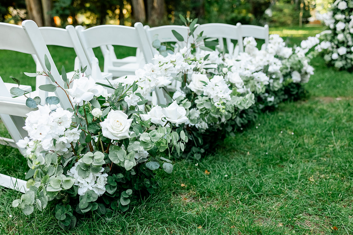 This set of aisle flowers is the epitome of classic, with stark white florals paired with lush greenery. These arrangements are sure to elevate any space! This is a set of 12 bushes that can be used in a variety of ways, working well as aisle flowers, lining a staircase, surrounding your head table at reception or at the altar to emphasize your momentous occasion. This set goes well with everything, and pairs especially well with The Elegance Arch which can be rented separately.