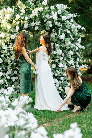 Although this arch has a limited colour palette, it is rich in variety with many shapes and texture. Its dynamic design is accomplished through a combination of white playa blanca roses, delphinium, veronica, lilac, ranunculus, peonies, garden roses, sweet Juliet roses, rose buds, and lisianthus all emerging from two tones of eucalyptus.
